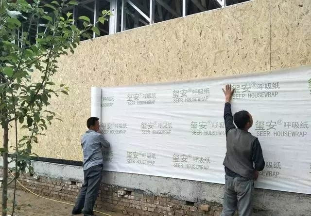 在外墻歐松板上鋪設單向呼吸紙,氣密性好,既可以隔絕空氣中的水汽,保證空氣流通,還可以穩定室內溫濕度,在一個可控的范圍之內!