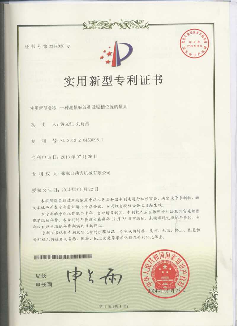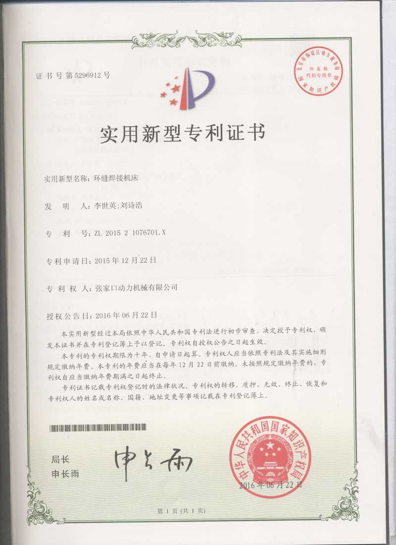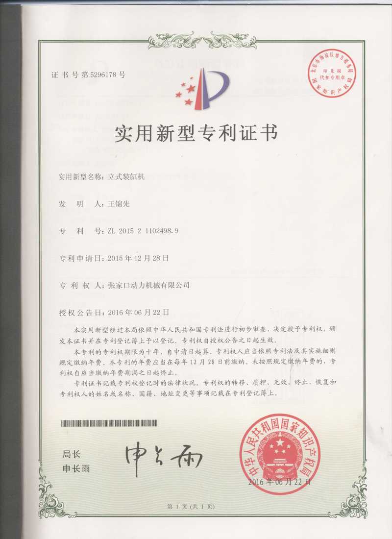 张家口动务机械有限公司专利证书展示